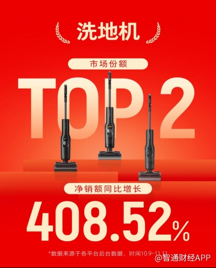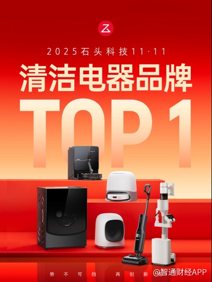 2025年双十一期间,石头科技洗地机市场份额高达25.02%,净销额同比增长高达408.52%。