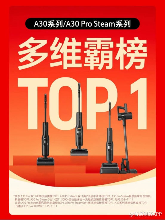 石头科技旗舰款洗地机,A30/A30 ProSteam系列稳居多平台销额第一,包括京东双十一洗地机热卖榜第一、京东双十一蒸汽&热水洗地机第一、京东3000+价位段多合一洗地机热销商品榜第一、天猫蒸汽拖把热卖榜第一等。