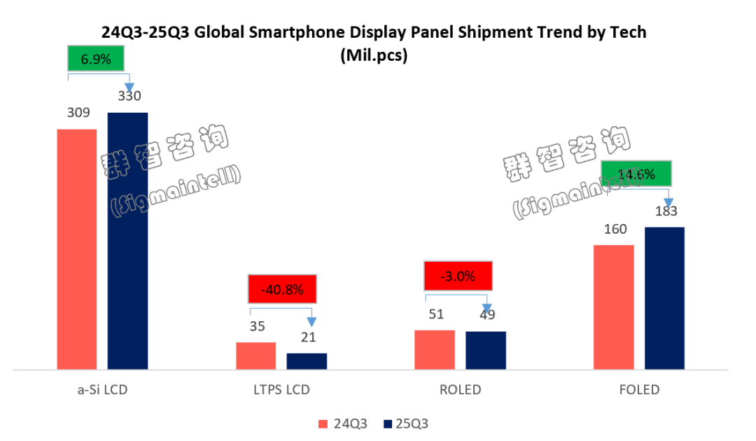 a-Si LCD方面,依托华南维修市场的坚实支撑,核心需求基本面未发生松动,仍保持同比增长态势。2025年第三季度,全球 a-Si LCD 智能手机面板出货量约 3.3 亿片,同比增长 6.9%,仍为支撑整体市场规模的重要基石。