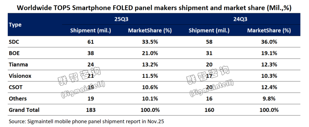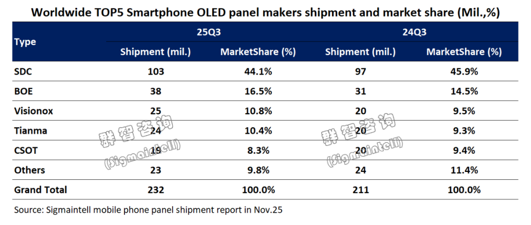 2025 年第三季度,全球智能手机面板市场格局延续 “国内厂商主导、韩厂坚守高端” 的竞争态势,京东方(BOE)、三星显示(SDC)、华星光电(CSOT)稳居出货量前三,头部集中度进一步稳固,Top 3厂商市场总份额达53.8%。