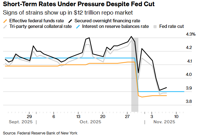 持续至周三晚间的政府停摆推迟了本应提振流动性的联邦支出,使情况恶化。与此同时,美联储持续缩减资产负债表的努力(即量化紧缩)也起到了一定作用。