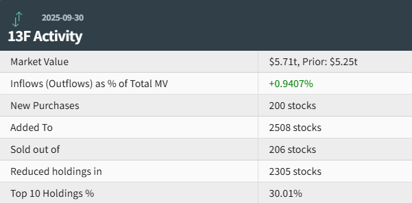 据统计,贝莱德第三季度持仓总市值为5.71万亿美元,上一季度总市值为5.25万亿美元,环比增长8.76%。该基金在第三季度的投资组合中新增了200只个股,增持了2508只个股,减持了2305只个股,清仓了206只个股。其中前十大持仓标的占总市值的30.01%。