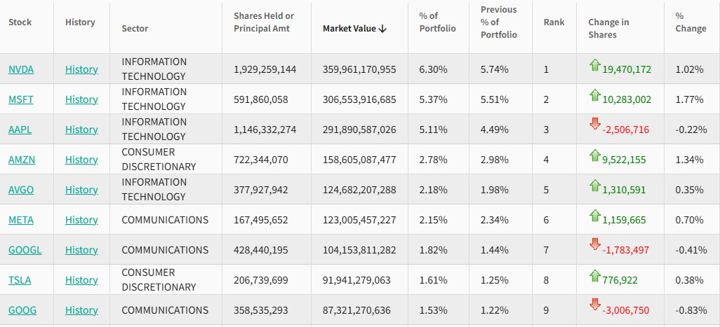 在前五大重仓股中,英伟达(NVDA.US)位列第一,持仓约19.29亿股,持仓市值约3599.61亿美元,占投资组合比例为6.30%,较上季度持仓数量增加1.02%。
