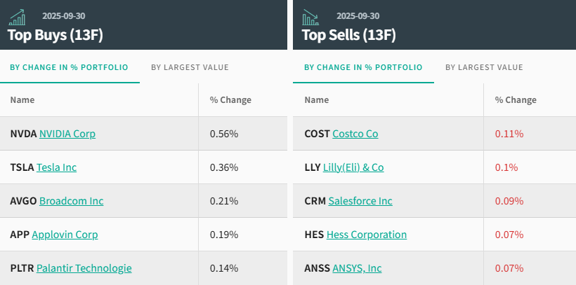 从持仓比例变化来看,前五大买入标的为:英伟达、特斯拉、博通、Applovin(APP.US)、Palantir Technology(PLTR.US)。
