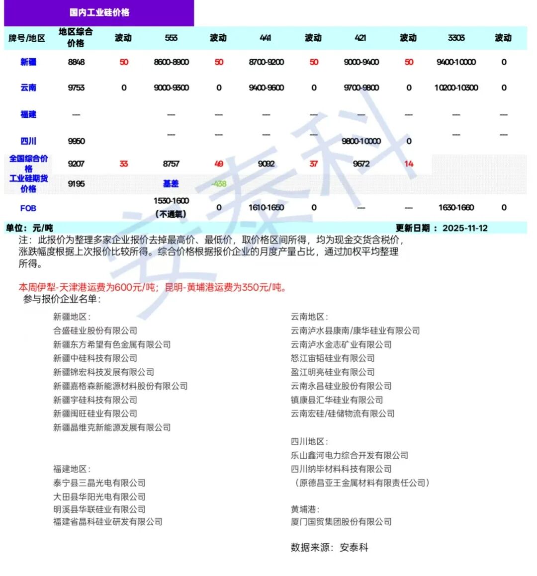 本周工业硅市场价格因期现联动小幅上涨,走势一致。11月6日至11月12日,主力合约2601收盘价从9065元/吨上涨至9195元/吨,上涨130元/吨。根据安泰科采集价格统计,11月12日全国工业硅综合价格为9207元/吨,上涨33元/吨。分牌号来看,553#工业硅价格为8757元/吨,上涨49元/吨,441#工业硅价格为9092元/吨,上涨37元/吨,421#工业硅价格为9672元/吨,上涨14元/吨;分区域看,新疆、云南、四川综合价格分别为8848元/吨、9753元/吨、9950元/吨;出口FOB价格与上周持平。