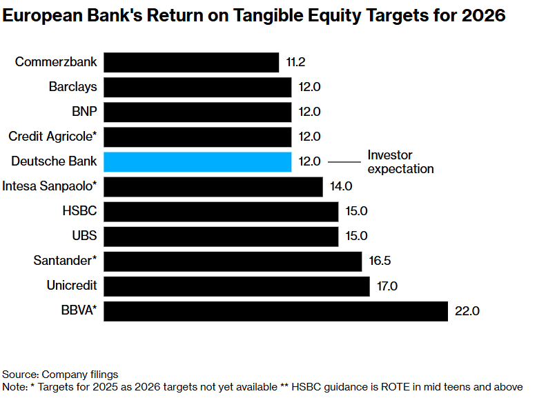 下图为欧洲大型商业银行2026年有形股本回报率(ROTE)目标,这些预期均较前几年的普遍水平明显改善。多位大型机构投资者表示,他们预计德意志银行管理层会将有形股本回报率(ROTE)的目标提升至12%甚至更高目标。根据其长期激励计划,该银行的薪酬体系已将董事会成员奖金与在2025–2027年实现这一目标全面挂钩。