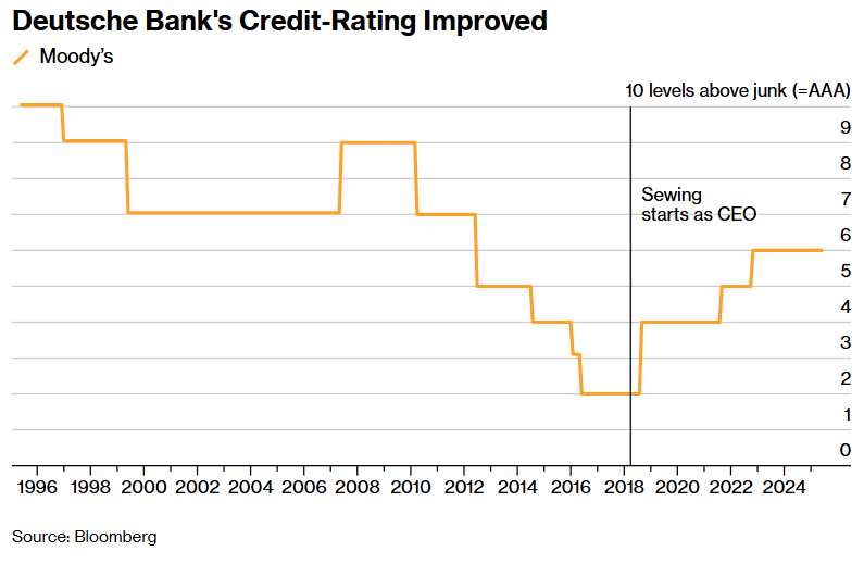 “零售型银行业务一直拖累整个德意志银行集团的盈利能力,但最近已经有所改善,”来自Union Investment的基金经理Annecke在采访中表示。“我们希望获这些战略规划能够获提供更多的细节,了解该行将如何推进零售业务的发展趋势。”上图为德意志银行的信用评级持续改善进程,得益于德银在塞温的战略领导下重拾业绩增长曲线。