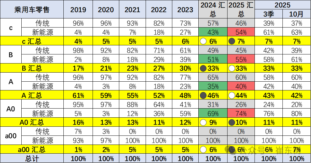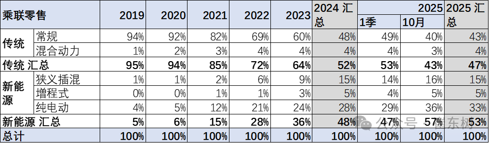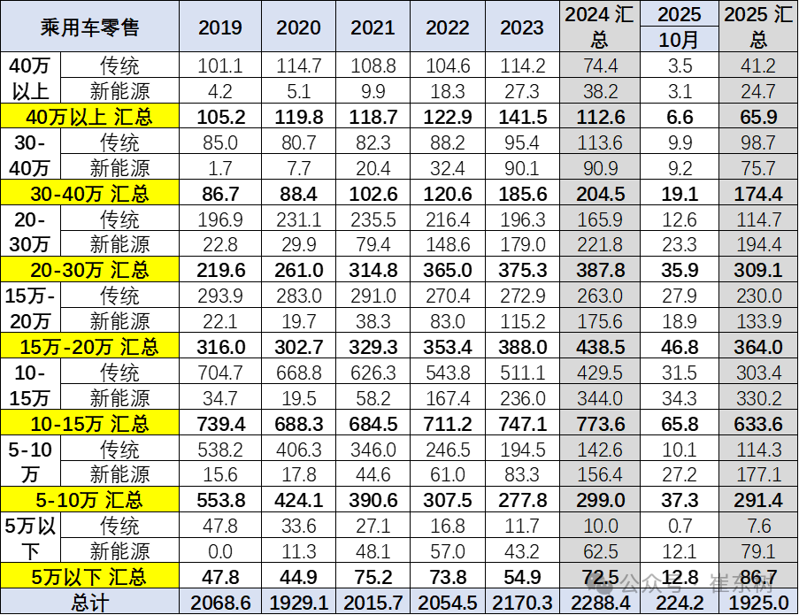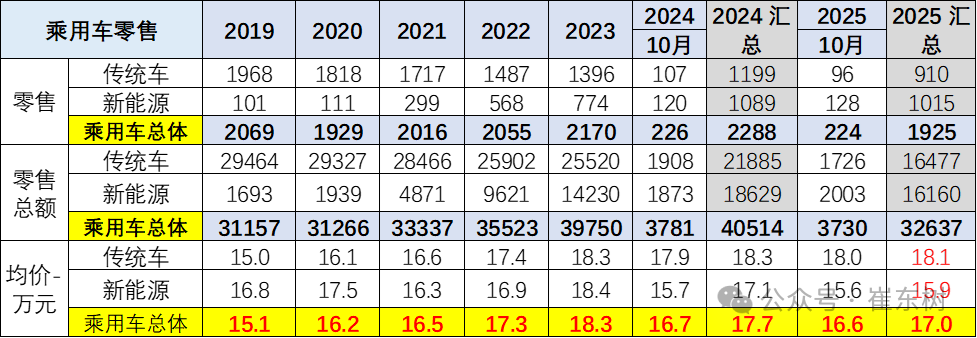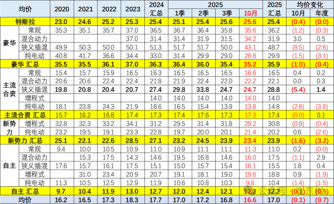 前期常规燃油车价格持续上升,市场萎缩在中低端很明显,而高端萎缩慢,因此从2019年的15万元上升到2023年的18.3万元。2025年随着高端燃油车的较快萎缩,2025年1-10月的均价降低到18.1万元,10月18.0万元,燃油车购买群体买车逐步稳定。
