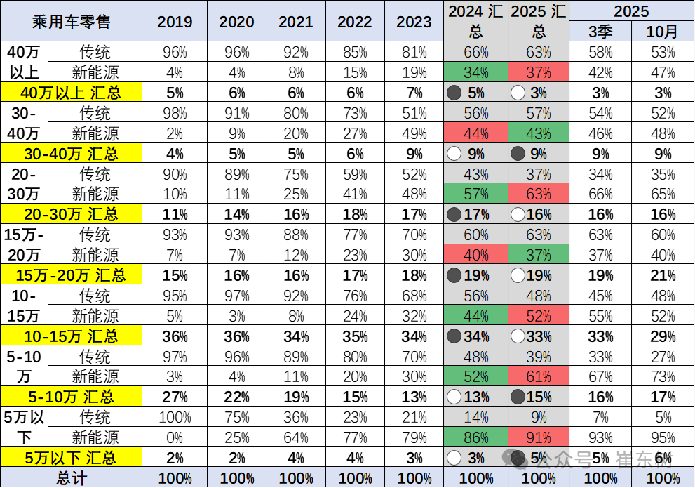 5万元以下车型2021-2022年较2020年的占比持续上升,主要是微型电动车的销量贡献。但2023年以来又持续下降,2025年的5万元以下车型的销量占5%,较2024年上升2个百分点。5-15万元的传统车型的销量下滑与新能源车的增长抵消后,增长的趋势仍存在。