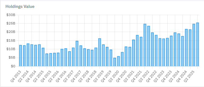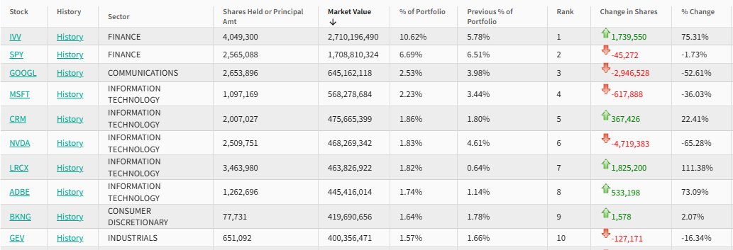 在前五大重仓股中,标普500指数ETF-iShares(IVV.US)位列第一,持仓约405万股,持仓市值约为27.10亿美元,占投资组合比例为10.62%,较上季度持仓数量大增75.31%。