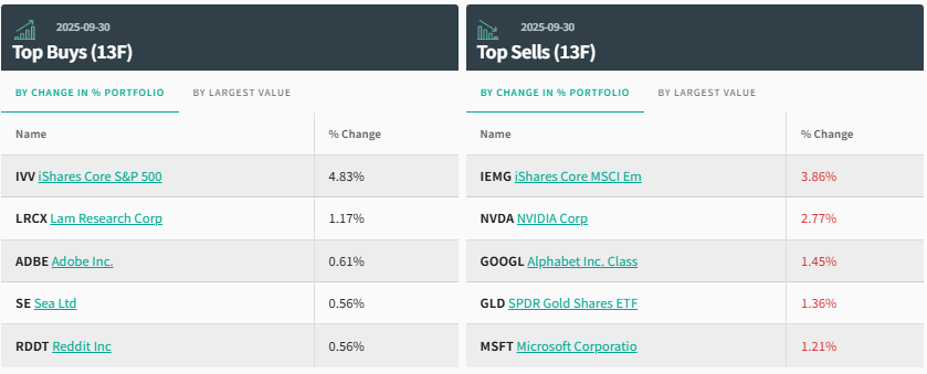 从持仓比例变化来看,前五大买入标的分别是:标普500指数ETF-iShares、泛林集团、Adobe、Sea(SE.US)、Reddit。