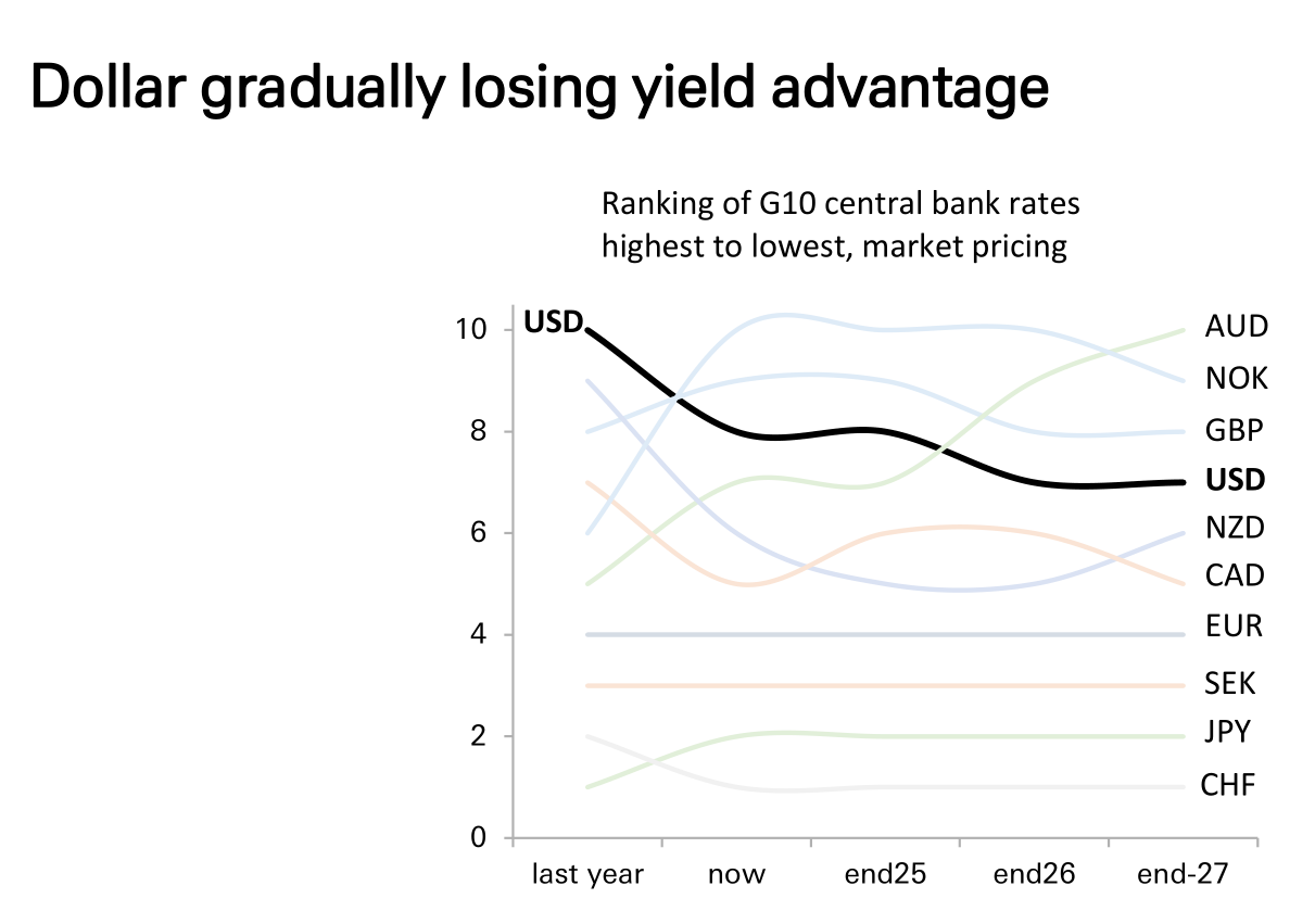 然而,这一核心支柱正在瓦解。根据市场定价对G10央行利率的预测,美元的收益率排名正面临显著下滑。报告图表显示,美元利率在G10货币中的排名,预计将从“去年”和“现在”的最高位,逐步下滑至2026年底及2027年底的中游位置。 与此同时,英镑、澳元、挪威克朗等货币的收益率排名预计将超越美元。