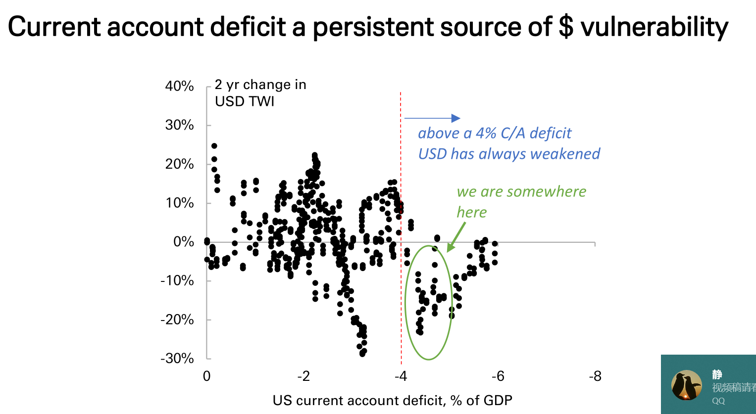 美国的国际收支状况是其长期存在的结构性弱点。报告强调,经常账户赤字是美元持续的脆弱性来源。 历史数据揭示了一个严峻的规律:一旦美国经常账户赤字占GDP的比重超过4%,美元无一例外都会走弱。 报告图表暗示,目前美国正处于这一危险区域附近。