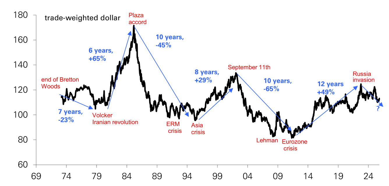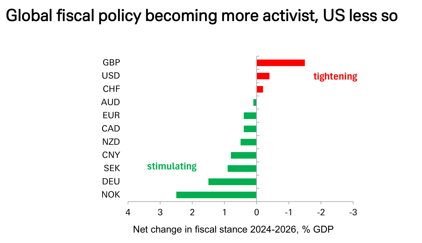 此外,从财政政策角度看,全球趋势也在发生变化。数据显示,在2024-2026年期间,美国的财政立场将趋于收紧,而欧元区和英国等地的财政政策则更具刺激性。 这种“全球财政政策更积极,而美国相对保守”的格局,将进一步削弱美国经济的相对增长优势,从而对美元构成压力。