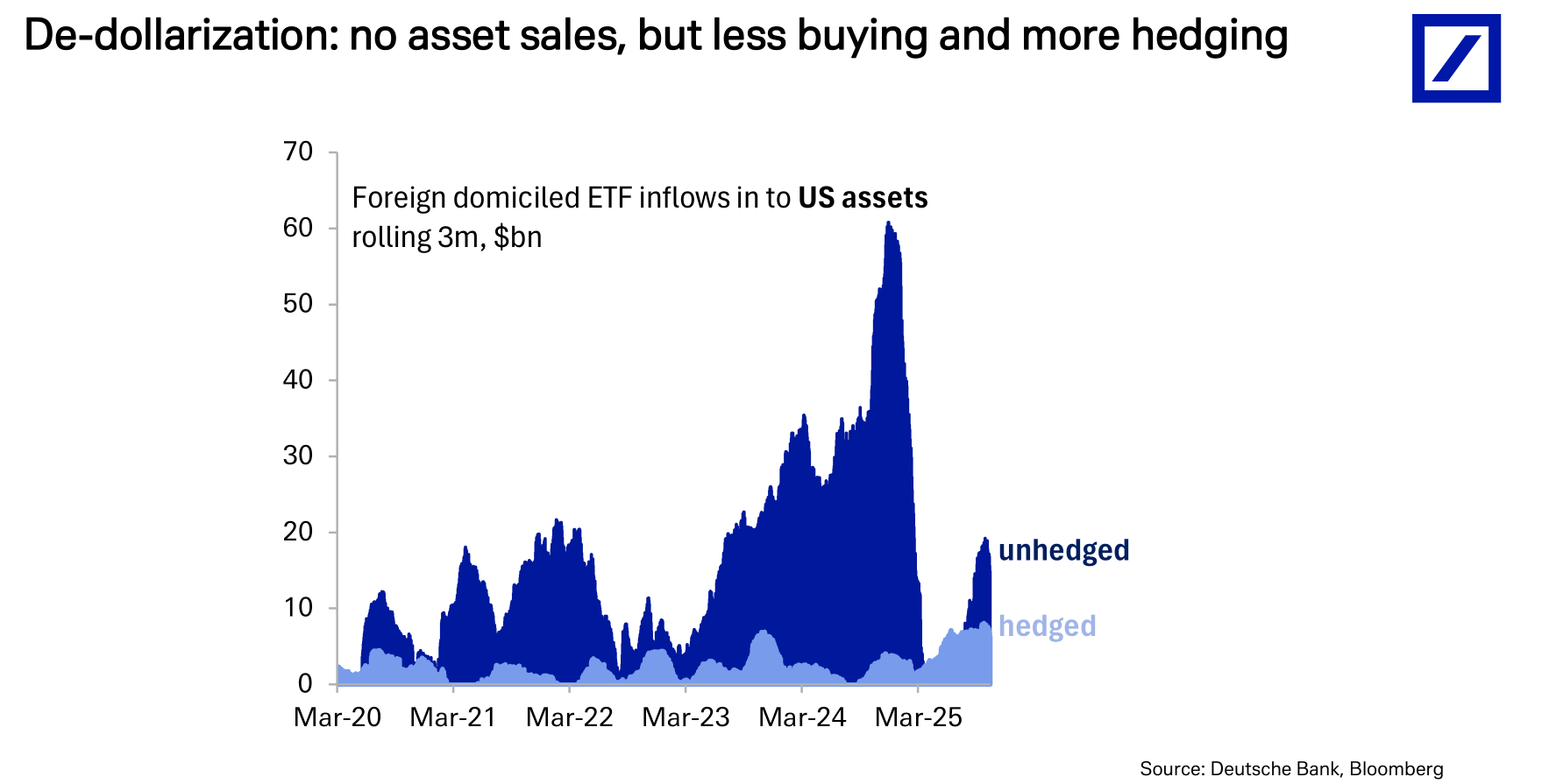 流入美国资产的外国ETF资金中,“未对冲”(unhedged)的资金流入量持续下降,而“已对冲”(hedged)的资金流入量则稳步上升。 这意味着,尽管海外投资者仍在买入美国资产,但他们越来越倾向于对冲掉美元贬值的风险。这种“去美元化”的对冲行为,本身就构成了对美元的下行压力,反映出市场对美元未来走势的悲观预期。
