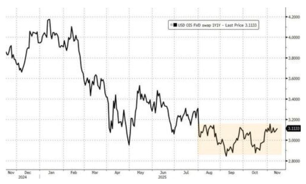 市场目前对12月降息的定价已降至50%以下。尽管随着美国政府重开,经济数据将陆续出炉,但投资者亦面临多重数据空白:10月非农就业报告可能无法发布,11月就业报告可能在12月FOMC会议前无法获得,通胀数据也可能出现缺失。在数据缺失的情况下,美国利率市场正处于观望模式,1年期远期1年期利率在窄幅区间内波动。