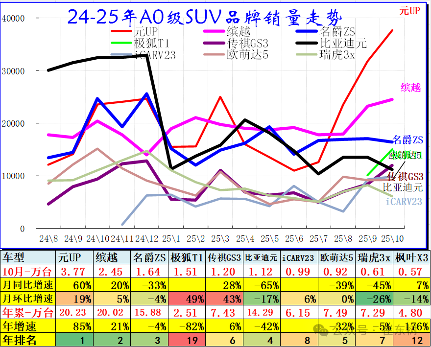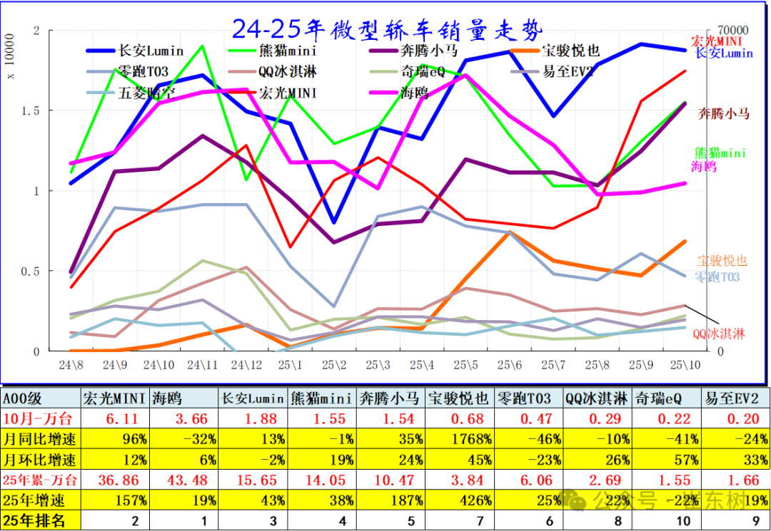 A0级轿车的全面电动化趋势明显,基本没有太强的燃油车产品,体现了自主的纯电动的产品优势明显。