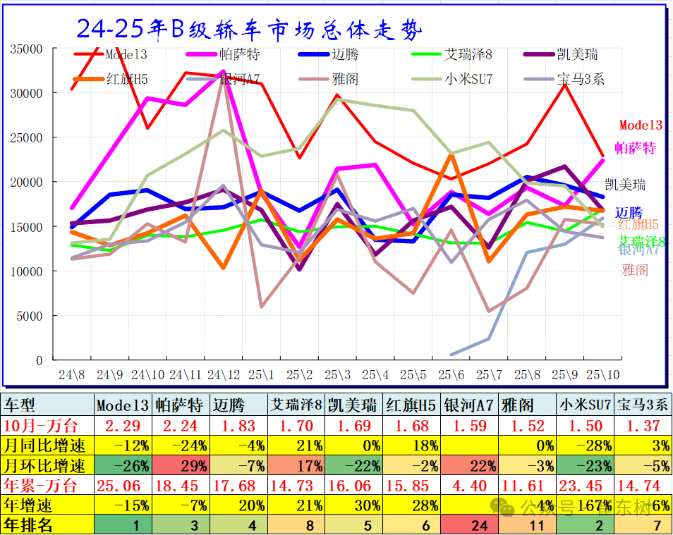 B级轿车2025年10月批发36.88万台,占批发份额31.41%,批发较去年同期同比增长3%,批发环比今年上月增长0%;2025年10月零售较去年同期同比增长4%,零售环比今年上月下降3%。2025年1-10月批发数量327.32万台,厂家批发销售累计增幅6%;2025年1-10月国内零售数量302.97万台,零售累计增幅9%。