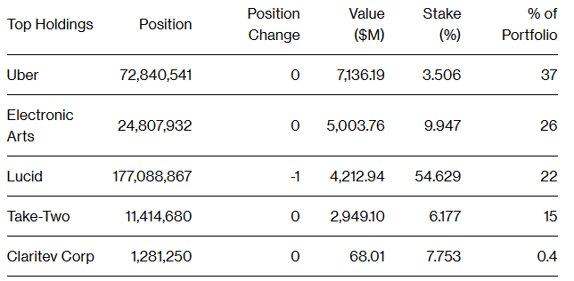 整体来看,根据提交的文件,PIF 在美国的主要持仓仍然是优步、艺电、Lucid 、Take-Two互动软件(TTWO.US)和Claritev(CTEV.US)。