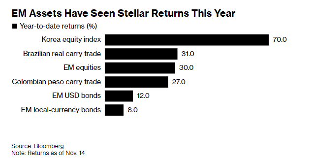MSCI新兴市场指数在今年前10个月每月均实现上涨,创下二十多年来最长连涨纪录。该指数累计涨幅近30%,有望实现2017年以来的最佳年度表现——2017年该指数曾大涨34%。但2018年随即出现17%的暴跌——当时美联储意外鹰派、中美贸易战爆发及美元飙升,导致过度拥挤的新兴市场股票、热门套息交易(即借入低收益货币买入高收益货币)及本币债券交易大幅回调。