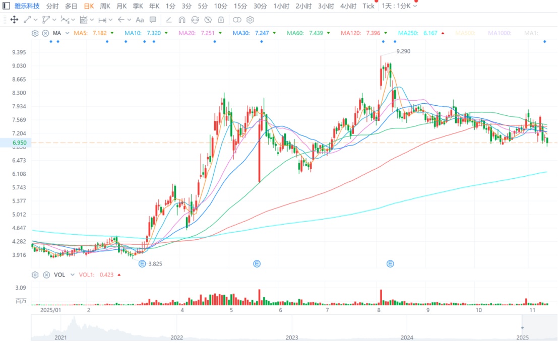 不过,与今年年初宣布加速回购后市场积极表现不同,雅乐科技在25Q3财报披露后,股价尚未止跌。11月13日公司股价最低点已下探至6.86美元,几乎回吐了今年6月20日后“二波拉升”行情的全部涨幅。