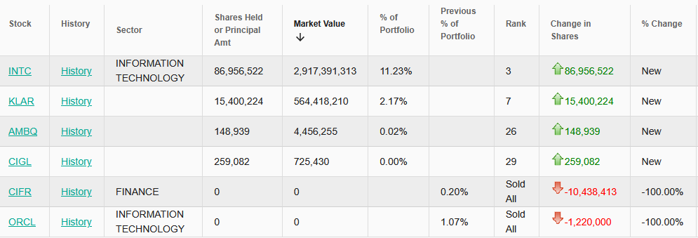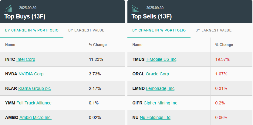 前五大卖出标的分别是:T-Mobile US、甲骨文、Lemonade、Cipher Mining、Nu Holdings。