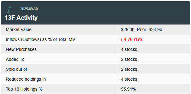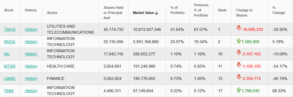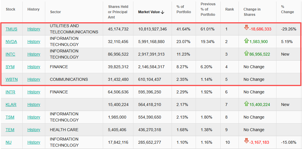 在前五大重仓股中,T-Mobile US(TMUS.US)位列第一,持仓约4517万股,持仓市值约为108亿美元,占投资组合比例为41.64%,持仓数量较上季度下降29.26%。