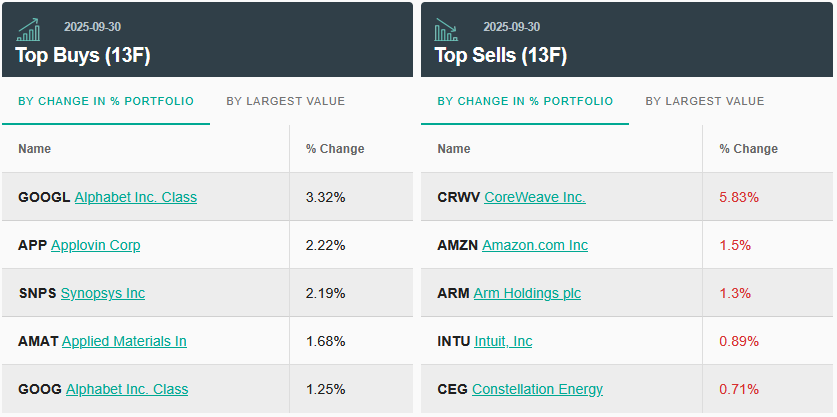 从持仓比例变化来看,前五大买入标的分别是:谷歌-A、Applovin(APP.US)、新思科技、应用材料、谷歌-C(GOOG.US)。