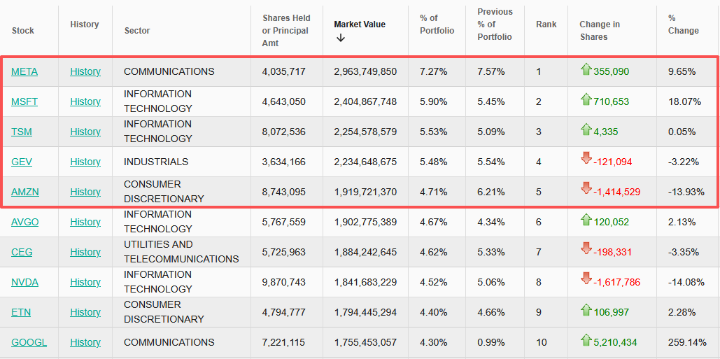 GE Vernova(GEV.US)位列第四,持仓约363万股,持仓市值约为22亿美元,占投资组合比例为5.48%,较上季度的持仓数量减少3.22%。