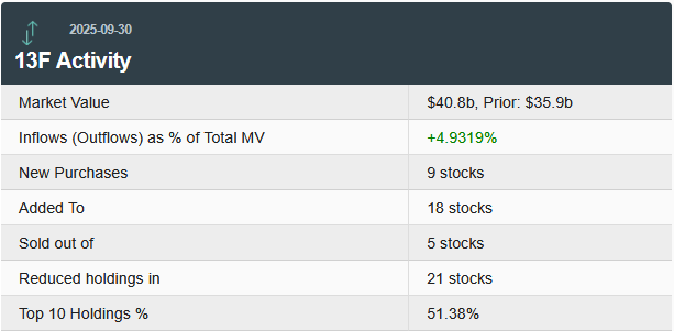 统计数据显示,Coatue第三季度持仓总市值达408亿美元,上一季度总市值为359亿美元,环比增长13.6%。Coatue在第三季度的持仓组合中新增了9只个股,增持了18只个股。同时,Coatue减持了21只个股,清仓了5只个股。其中,Coatue的前十大持仓标的占总市值的51.38%。
