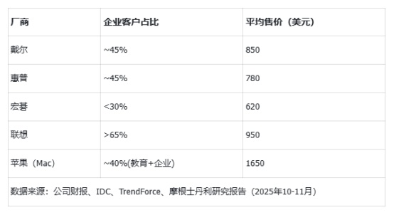 企业客户采购PC的决策逻辑与消费者截然不同:总拥有成本而非单纯购置价是核心考量。一台企业笔记本平均使用周期4-5年,IT部门更关注稳定性、可管理性和安全合规,而非几十美元的差价。比如,2025年企业端PC平均售价高达1100美元以上,而消费端平均售价只有620美元,这让前者更容易将成本向客户传导。