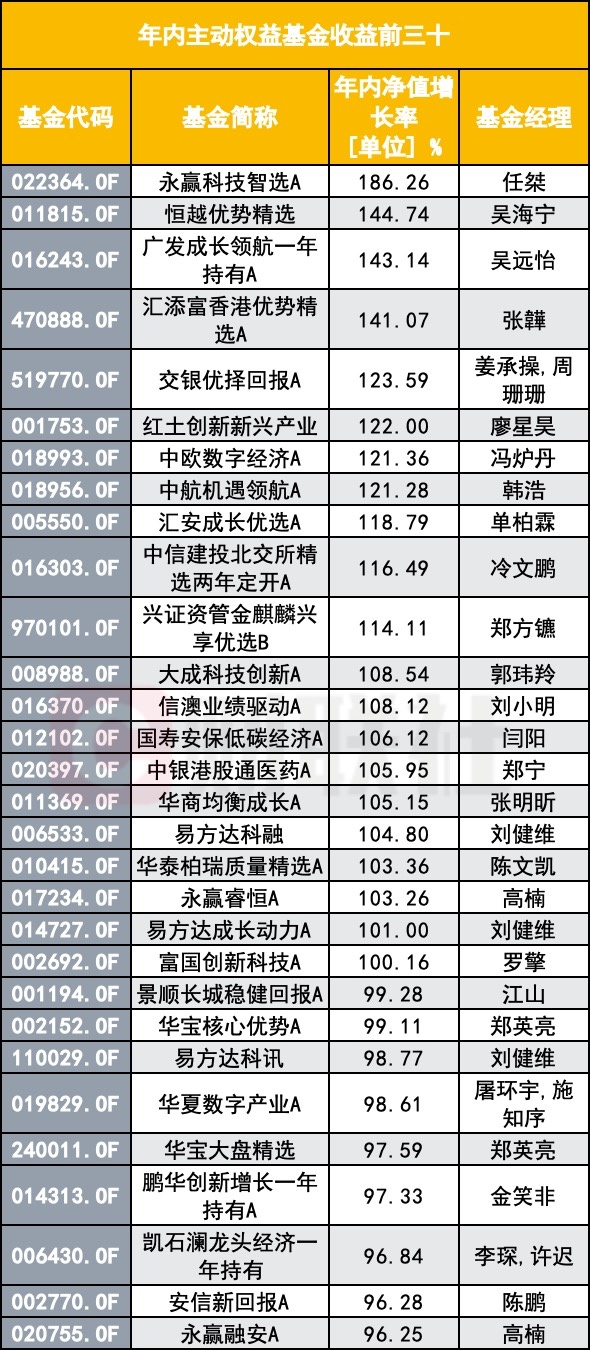 在这一长长的名单里,4586只产品实现正收益,占比超过96%,仅155只基金仍在负收益区间挣扎,赚钱效应之强,为近年少见。值得关注的是,前十名的门槛已经抬升至116%左右。与去年同期不到60%的水平相比,今年的排位标准几乎被改写。