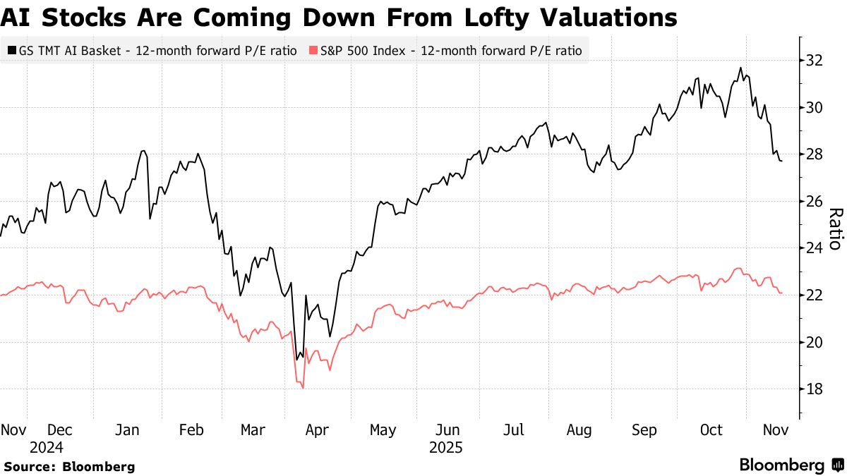 随着投资者对人工智能(AI)股票潜在泡沫的担忧加剧,今年迄今已上涨17%的MSCI全球指数已显现承压迹象。与此同时,标普500指数已较10月高点跌去约3%。