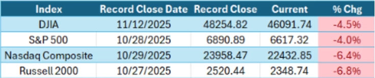过去四天的跌势使道指较上周创下的历史高点回落约4.5%,小盘股标普小型股指数也已超过下跌区间的一半,逼近技术性回调水平(从高点跌幅达10%)。根据道琼斯市场数据,标普500指数中已有324只成分股自52周高点回落超过10%,显示抛压广泛,而非集中于单一板块。