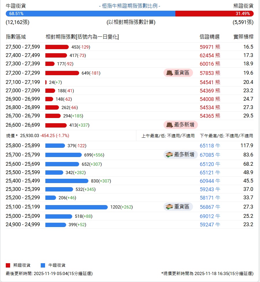 智通财经APP获悉,截至11月19日,恒指最新的牛熊街货比例为69:31。