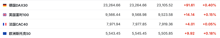 2. 截至发稿,德国DAX指数涨0.40%,英国富时100指数涨0.15%,法国CAC40指数涨0.05%,欧洲斯托克50指数涨0.18%。