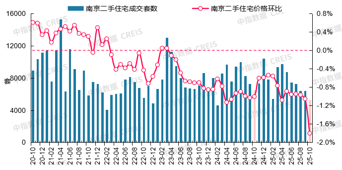 图:2020年10月至2025年10月南京二手住宅成交套数及二手住宅价格环比走势