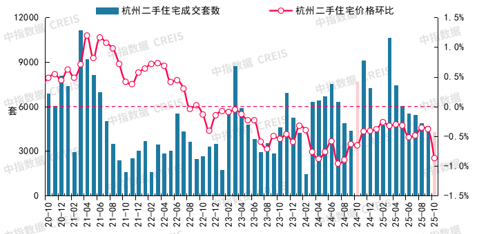 图:2020年10月至2025年10月杭州二手住宅成交套数及二手住宅价格环比走势