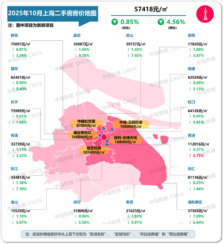 图:2025年10月上海各市辖区二手住宅挂牌均价及同环比