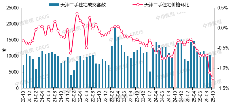 图:2020年10月至2025年10月天津二手住宅成交套数及二手住宅价格环比走势