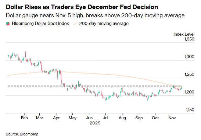 “美元今日表现出强劲反弹势头,”美国银行策略师Alex Cohen表示,“我认为美元仍存在一些不对称的上行风险,因为市场仍需数据来证明12月降息的合理性。”