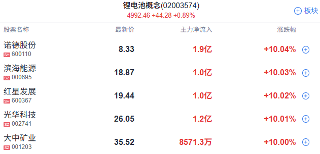 盘面上,锂电概念再度走强,盐湖提锂、能源金属等方向冲高,倍杰特20CM涨停,盛新锂能、久吾高科、富临精工、赣锋锂业跟涨;券商板块集体走高,首创证券高开超8%,东北证券、中国银河、中信建投涨幅居前;元件板块上行,中富电路、江海股份领涨,方正科技、景旺电子等多股均涨跟涨;电池板块拉升,滨海能源封板涨停,诺德科技涨近9%,福德科技、天赐材料等跟涨。