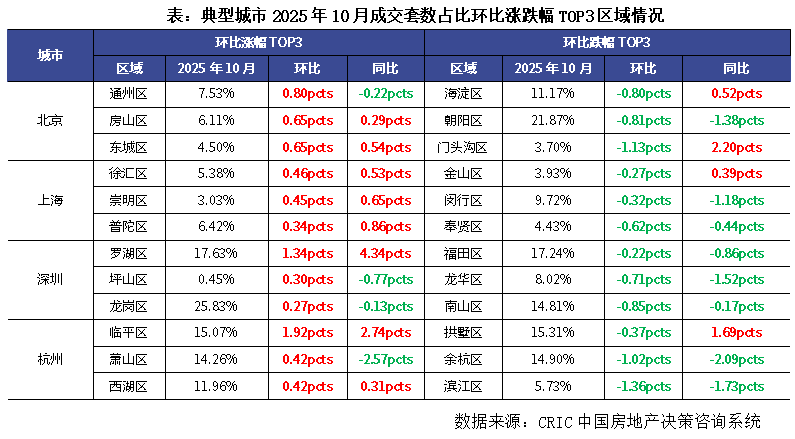 而从成交区域来看,上海成交占比持降的多为城市远郊片区,譬如上海金山区和奉贤区;北京、深圳、杭州成交占比持降的多为城市核心区,诸如北京海淀区和朝阳区,深圳福田区和南山区,杭州拱墅区和滨江区,值得关注的是,深圳主力区域成交集中度上升,据CRIC监测数据,深圳罗湖区和龙岗区除了是2025年10月环比涨幅TOP3区域之外,还是成交套数占比TOP3区域。