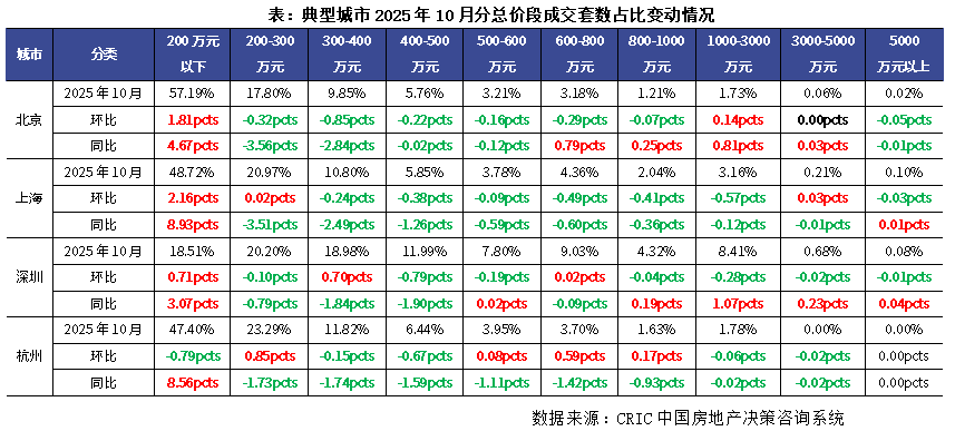 另一方面,对于沪深而言,新房市场中千万元豪宅产品入市对二手房高端客群分流作用愈发明显,呈现出典型替代效应。据CRIC监测数据,沪深2025年10月总价800万元以上房源成交套数占比环比均呈现出持平或回落。此外,杭州2025年10月总价500万-1000万元高端房源占比环比持增阶段性回升,但仍不及去年同期。