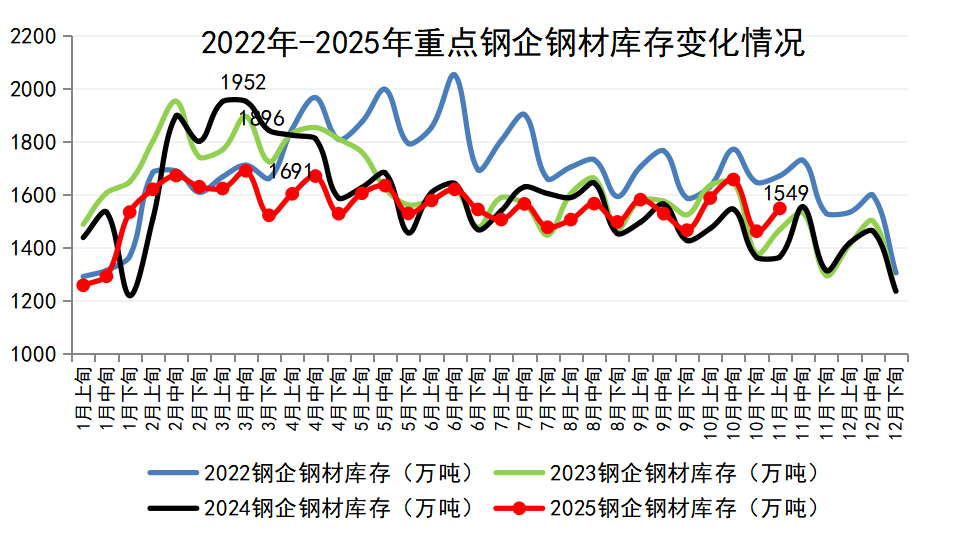 从企业库存来看,11月上旬重点钢企钢材库存位于近三年历史同期高位。2025年11月上旬重点钢铁企业钢材库存量为1549万吨,旬环比增加86万吨,上升5.9%;比上月同旬减少39万吨,下降2.5%;比去年同旬增加183万吨,上升13.4%。