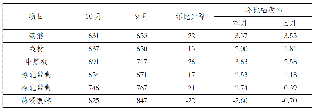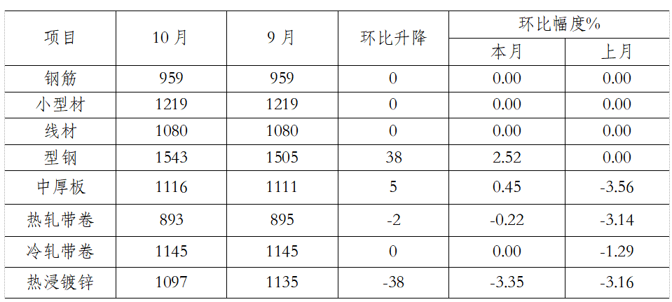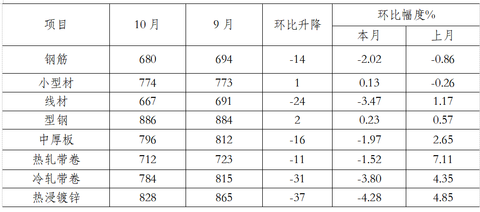 10月份,监测的八大钢材品种中,除冷轧薄板外主要钢材品种平均价格均下降。其中,热轧卷板价格下降较大,下降63元/吨;无缝管小幅下降,平均价格下降25元/吨。(见下表)
