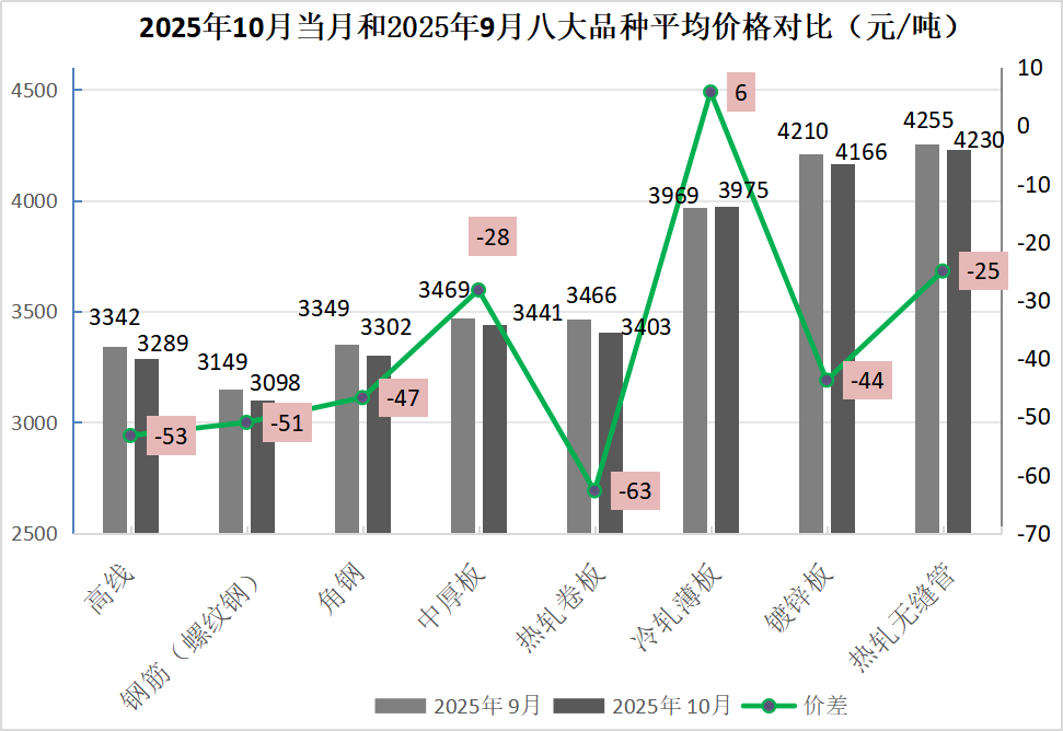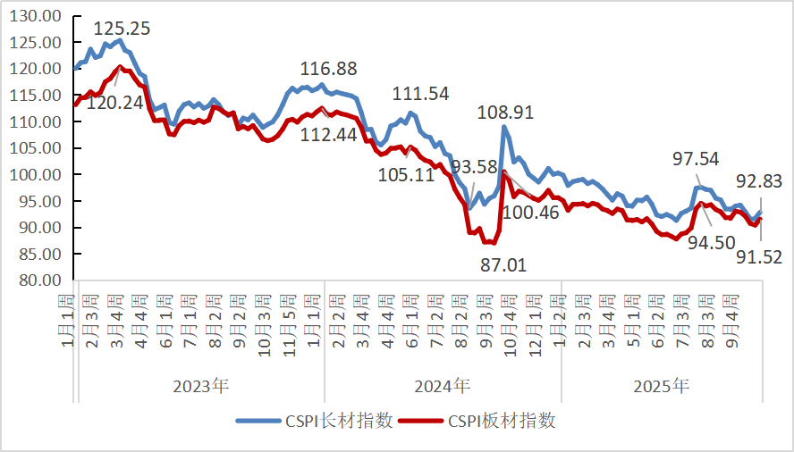 截至2025年10月末,CSPI长材指数为92.83点,环比下降1.33点,降幅为1.41%;CSPI板材指数为91.52点,环比下降1.31点,降幅为1.41%;与上年同期相比,CSPI长材、板材指数分别下降10.27点和下降5.26点,分别下降9.96%和5.44%。