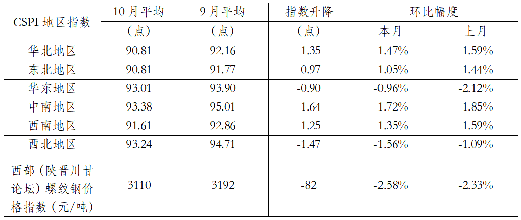 分地区来看,2025年10月份,CSPI全国六大地区钢材价格指数平均值环比均下降。其中,降幅较大的为中南地区,为1.72%,降幅较小的为华东地区,为0.96%。
