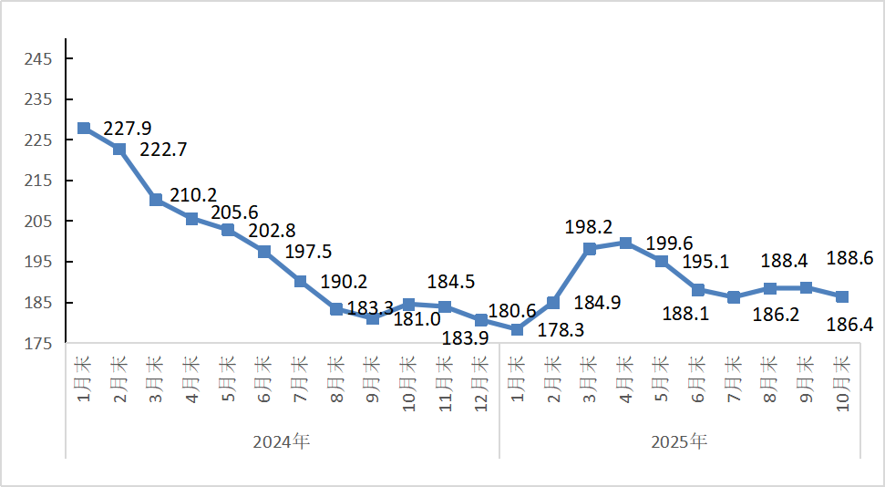 2025年10月份,CRU国际钢材价格指数为186.4点,环比下降2.2点,降幅为1.2%;同比上升1.9点,同比升幅为1.0 %。(见下图)