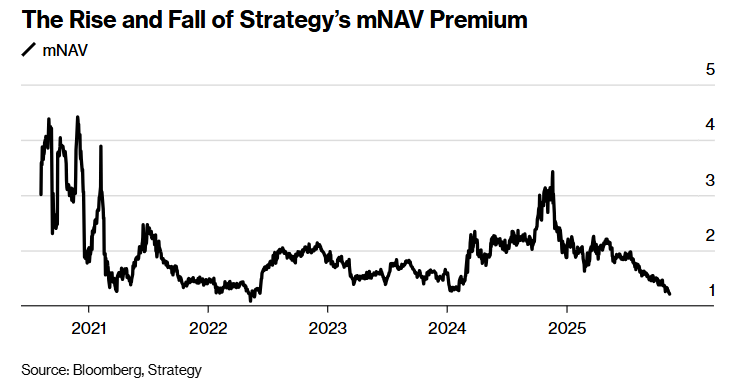 Strategy面临的麻烦远不止于指数层面。比特币已较10月高点下跌逾30%。加密货币市场总市值蒸发超过1万亿美元。而该公司的mNAV——即企业价值与比特币持有量之比——已跌至仅仅略高于1.1。意味着这个循环已不再像从前那样运转,支撑Strategy股价涨势的核心指标——mNAV甚至开始沦为拖累因素。下图显示为Strategy的mNAV溢价近期经历的大起大落。